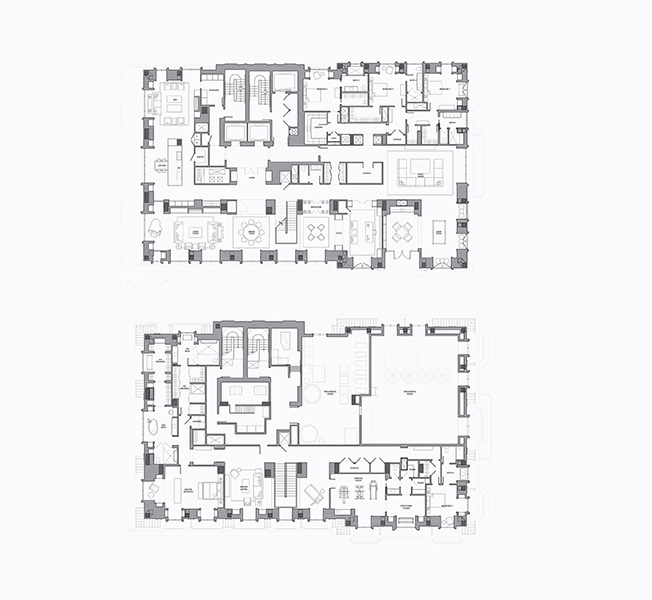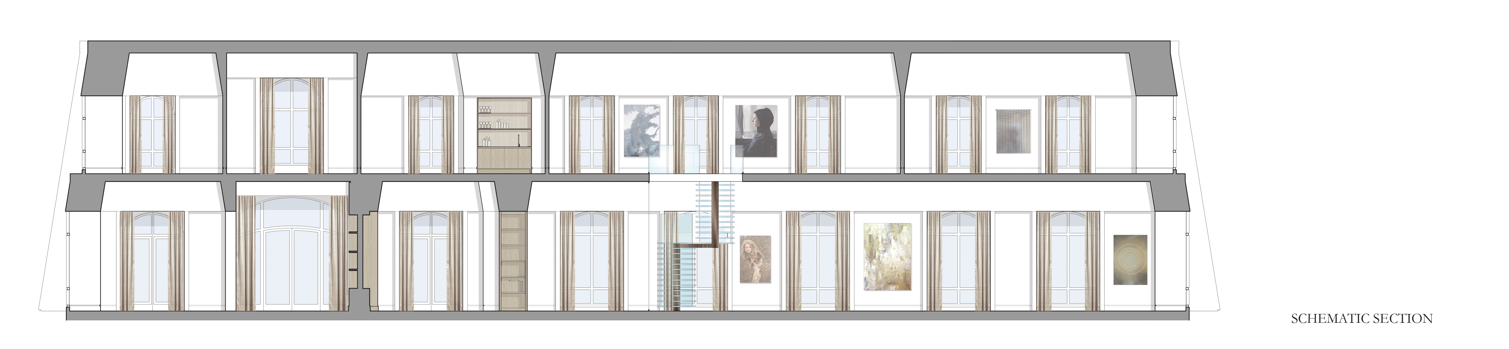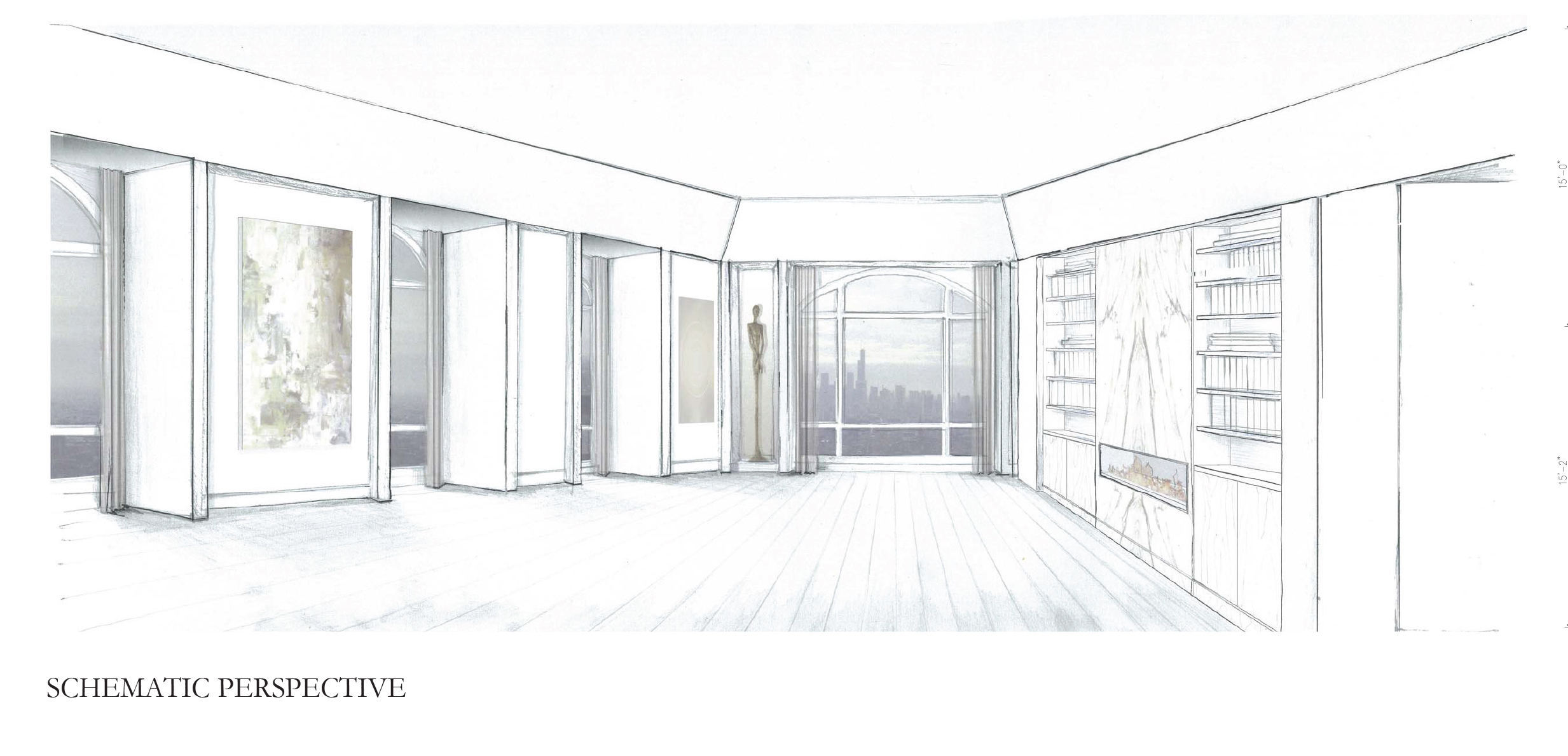 The conceptualized program for this raw, duplexed, 13,000 square foot space includes solutions to overcome irregular wall column spacing and slanting interior perimeter walls to accommodate an imagined art collection and window treatments. Space is programmed around existing plumbing and exhaust stacks, and extends visual axis to maximize sight lines. An SH Studio-conceived buyer profile aids in marketing the Chicago space.