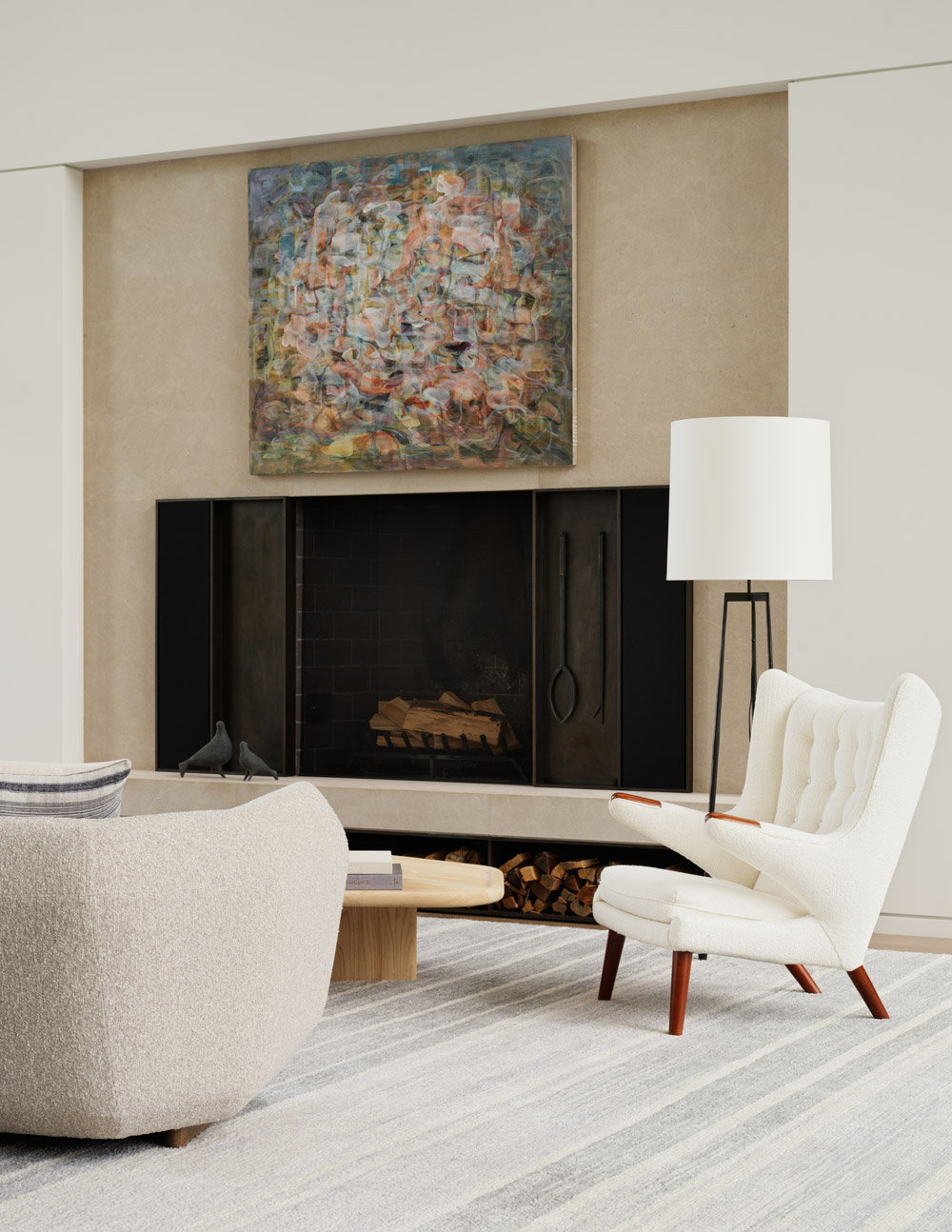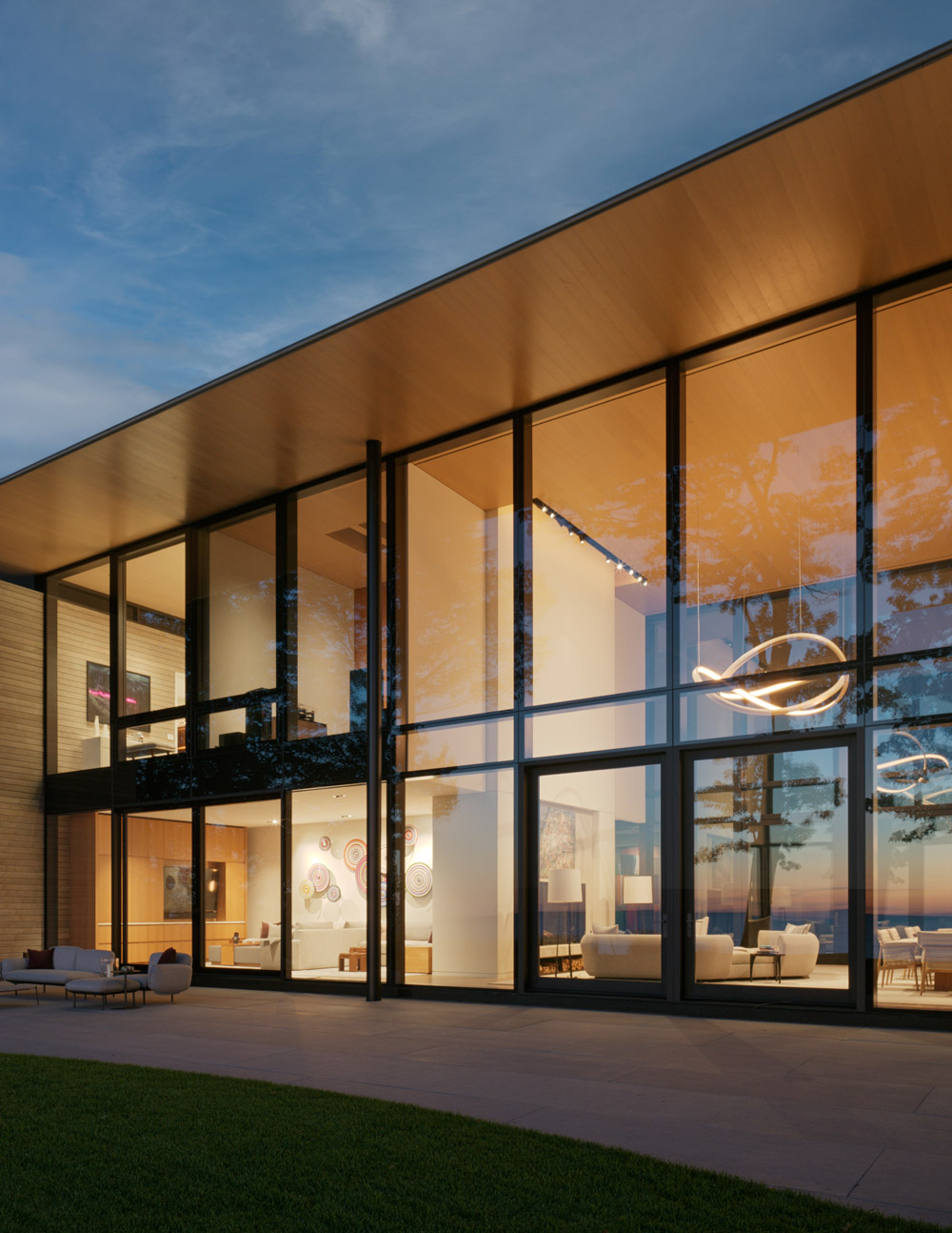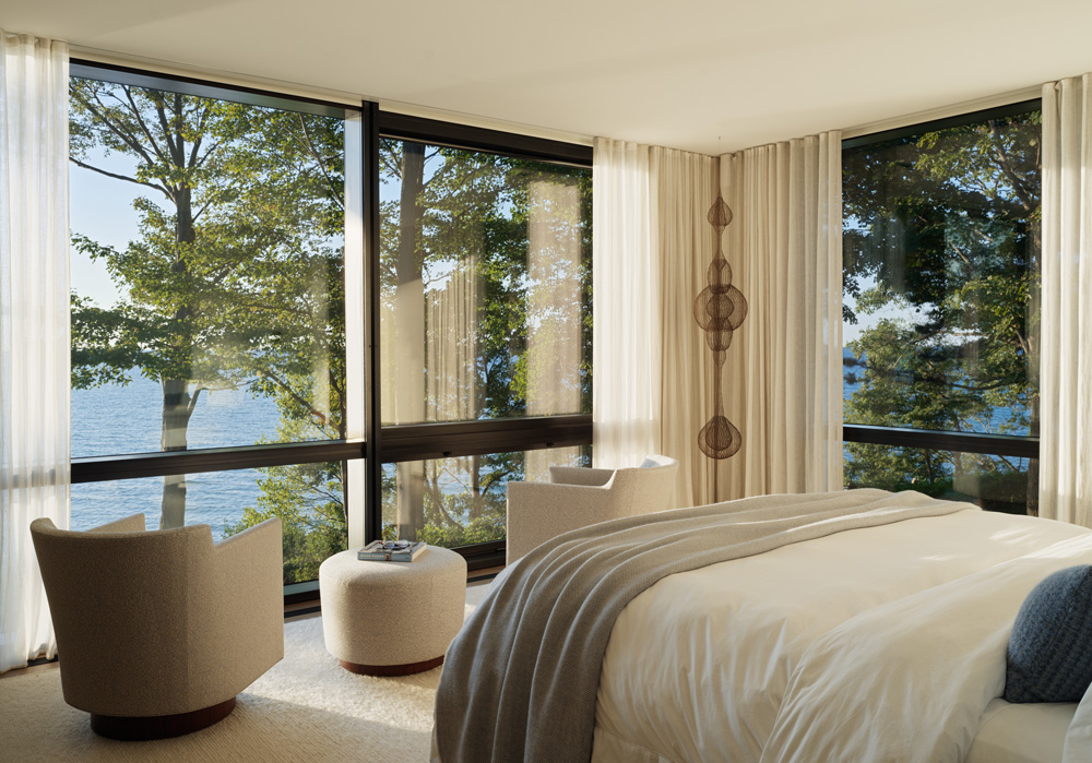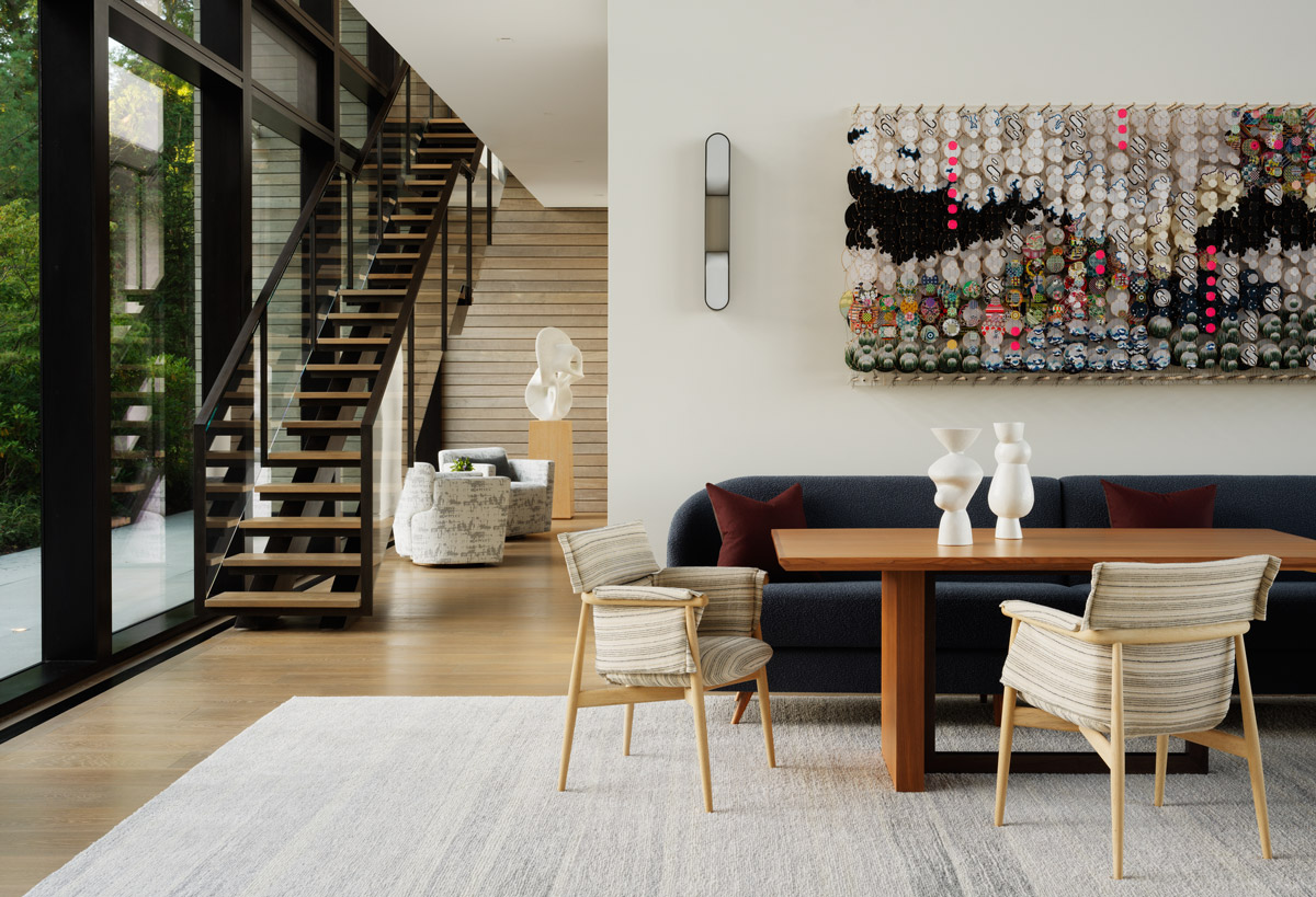 Just as it connects house to shore, this Michigan home connects multiple generations. Built on property next door to her parents’ own vacation home – where one half of our client pair spent her childhood – it’s a clean, crisp, modern interpretation of all that’s best about lakeside life. Views, relaxation, proximity to nature, and ease of living combine in a glass box that reveals and celebrates its location at every turn. A mere handful of materials – glass, walnut, steel, plaster, and stone – form a neutral, highly textured architectural envelope that is at once contemporary and warm. Challenging notions of modern simplicity being equal to cold, interiors are suffused with luxe fabrics, cozying rugs, and a colorful – and significant – collection of art that welcomes family members to gather throughout the seasons. With a mostly monochromatic color palette informed by light studies conducted over the course of a year, Lake Michigan waters and skies are reflected in the décor, which includes custom (and flexible) furnishings, custom SHIIR rugs, and plenty of warming elements designed from the get-go to augment the home’s architectural aspects.