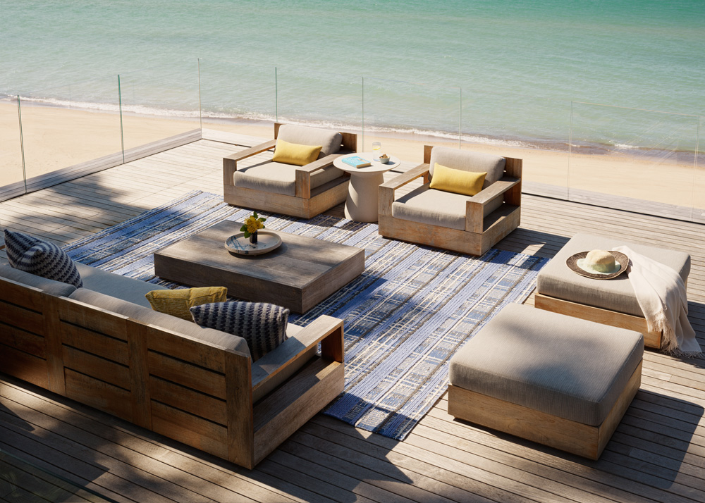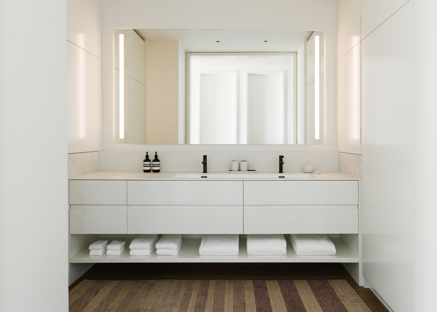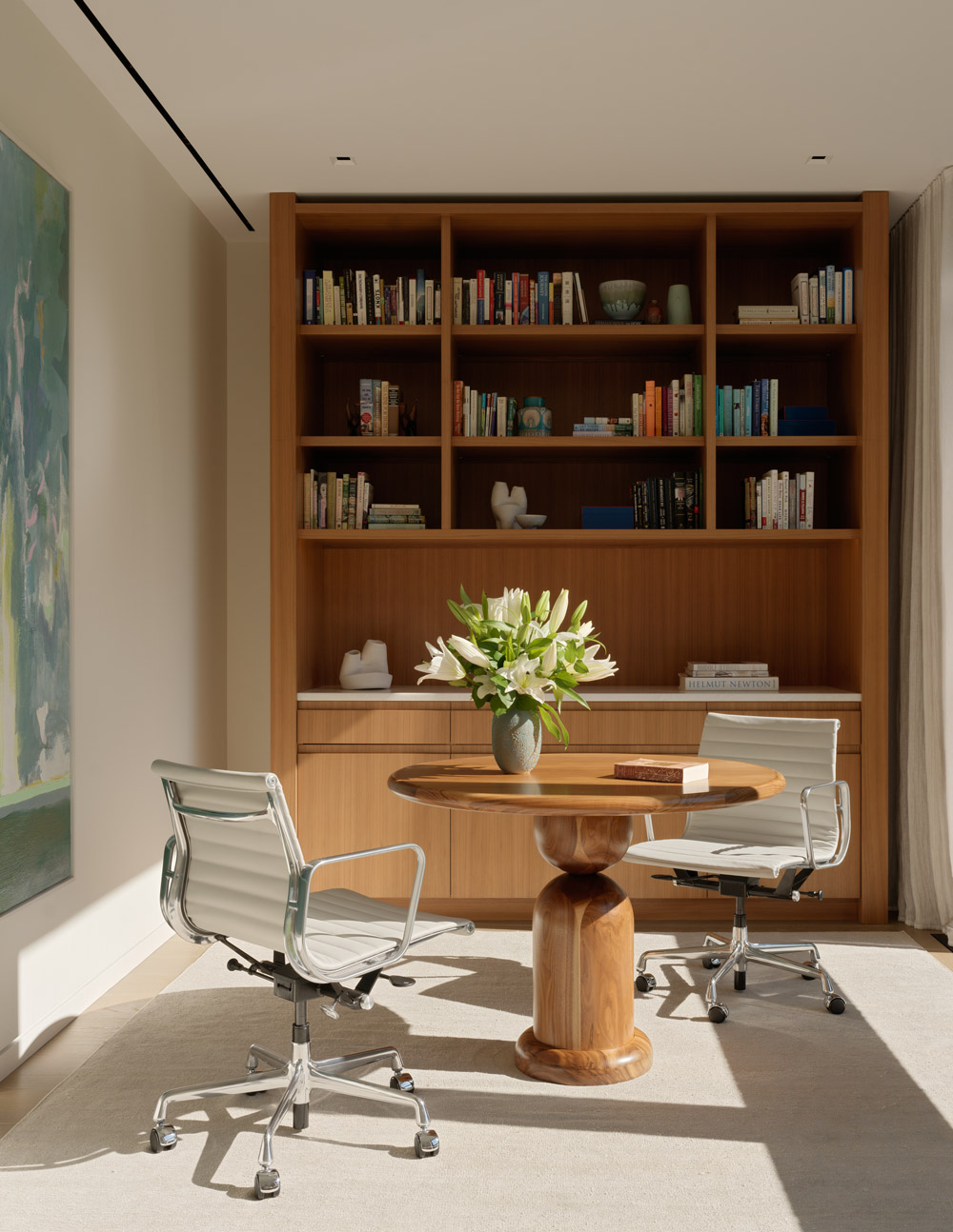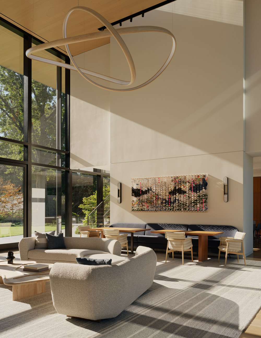 Just as it connects house to shore, this Michigan home connects multiple generations. Built on property next door to her parents’ own vacation home – where one half of our client pair spent her childhood – it’s a clean, crisp, modern interpretation of all that’s best about lakeside life. Views, relaxation, proximity to nature, and ease of living combine in a glass box that reveals and celebrates its location at every turn. A mere handful of materials – glass, walnut, steel, plaster, and stone – form a neutral, highly textured architectural envelope that is at once contemporary and warm. Challenging notions of modern simplicity being equal to cold, interiors are suffused with luxe fabrics, cozying rugs, and a colorful – and significant – collection of art that welcomes family members to gather throughout the seasons. With a mostly monochromatic color palette informed by light studies conducted over the course of a year, Lake Michigan waters and skies are reflected in the décor, which includes custom (and flexible) furnishings, custom SHIIR rugs, and plenty of warming elements designed from the get-go to augment the home’s architectural aspects.