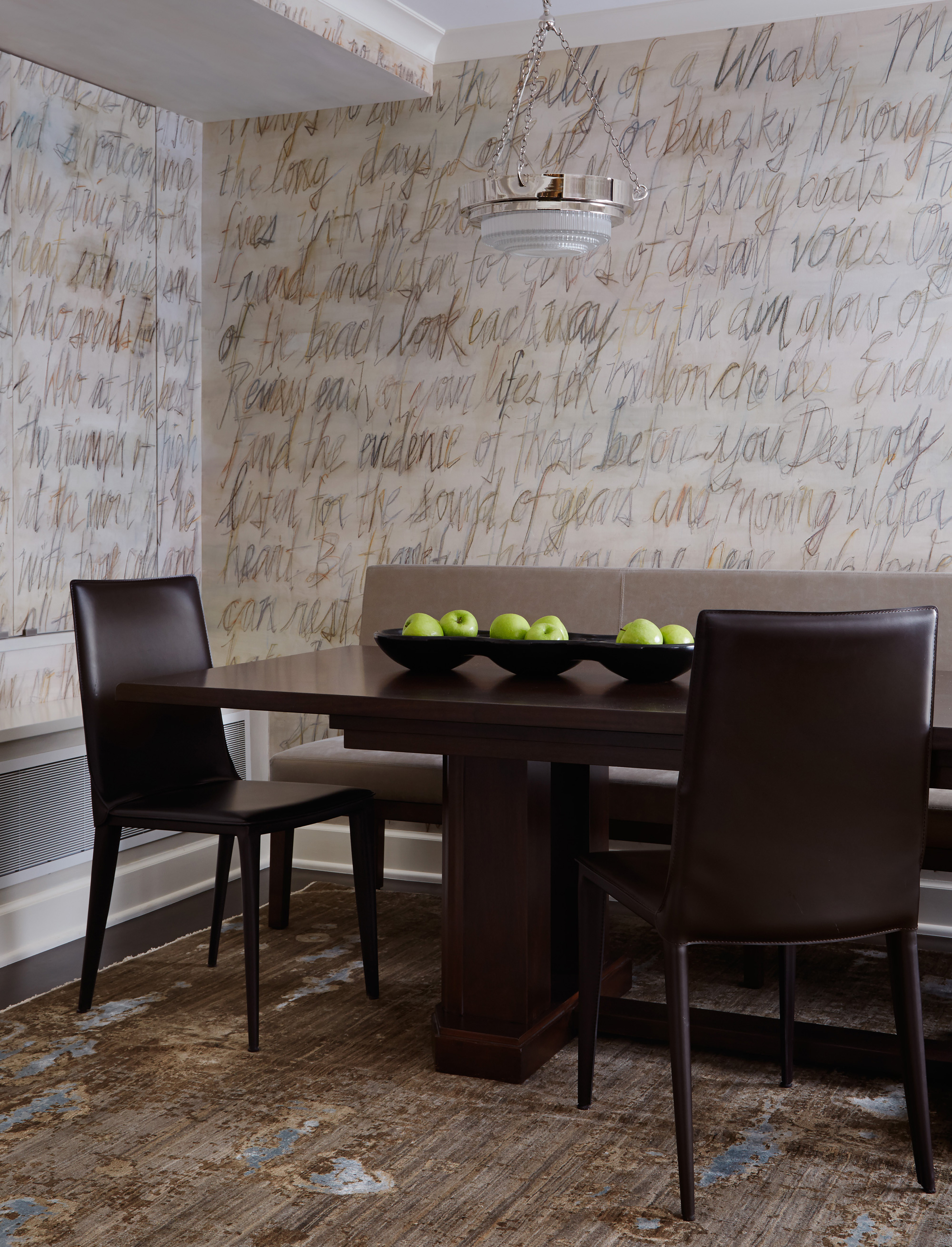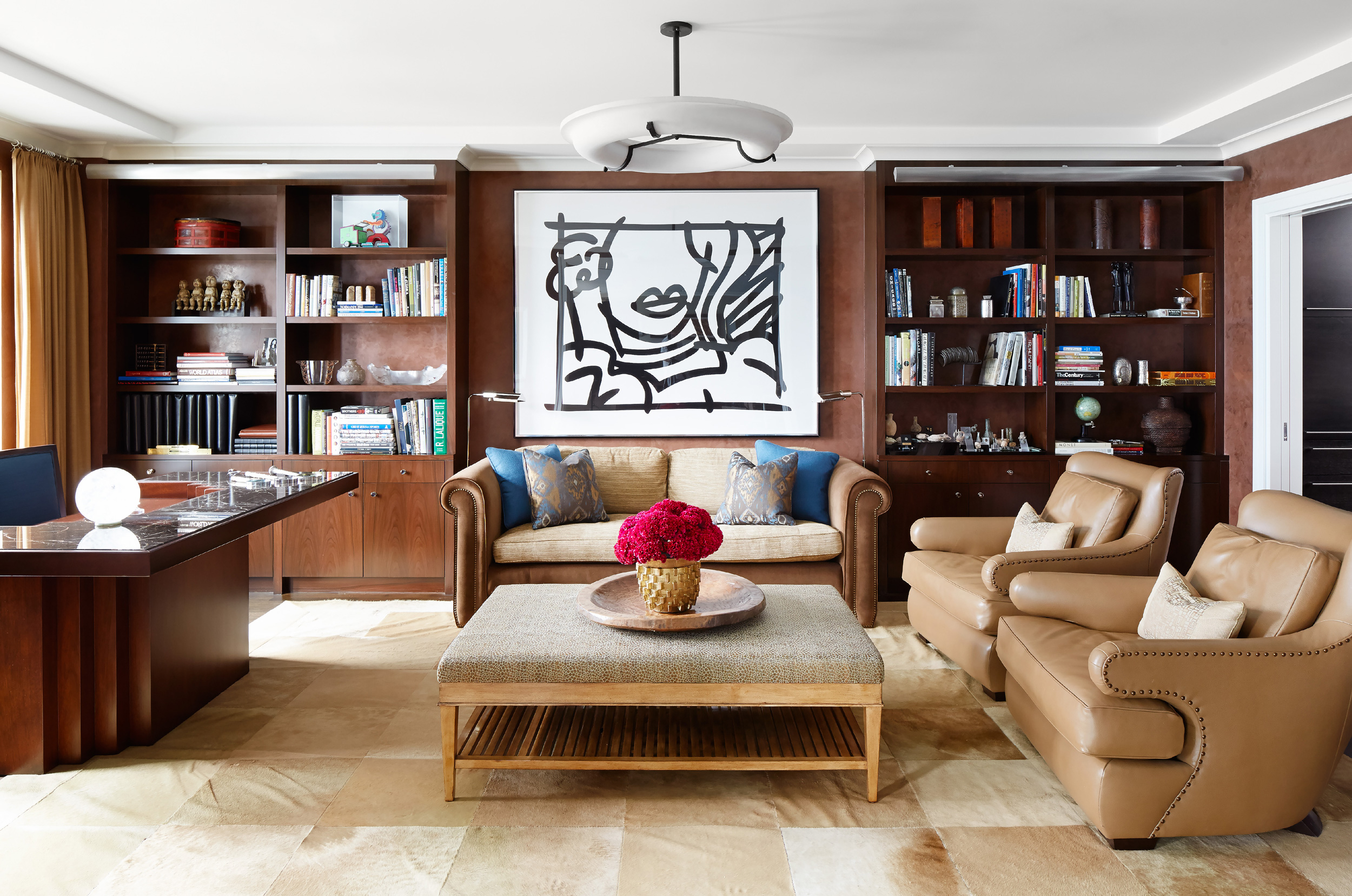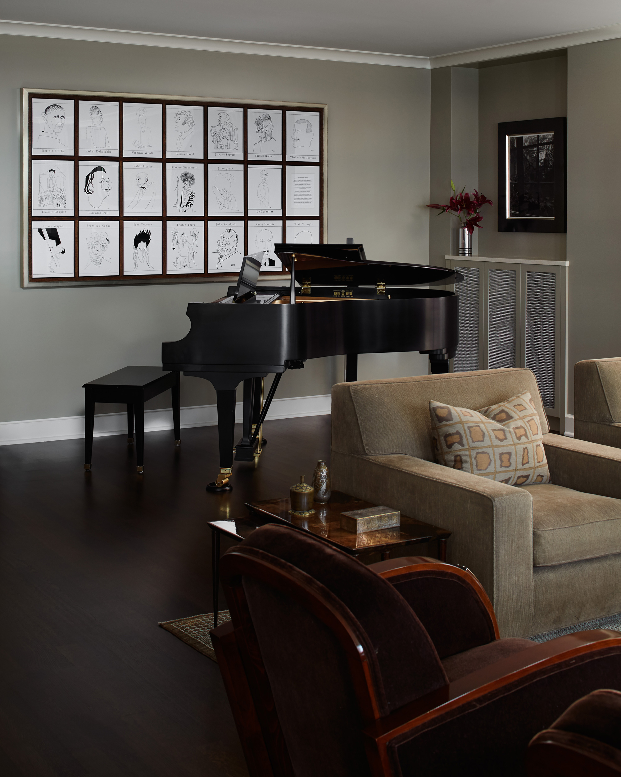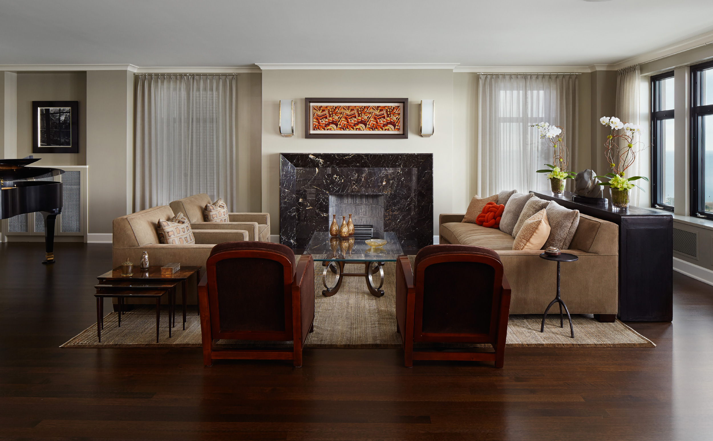 An outstanding collection of Art Deco furnishings, lighting, artwork, and accessories imbues this full-floor, Lake Shore Drive condominium with uncommon presence. Tailored in style and masculine in hue, it cocoons even as it welcomes light and views. Macassar ebony millwork and travertine floors evince its luxurious architectural side; sumptuous materials including silk velvet, cashmere, and shagreen articulate exquisite decorative elegance – as do pashmina draperies and parchment-covered walls. Also climbing walls: poetry, in this case written by the owner’s son and artistically hand-lettered by a local artisan. Layered in the extreme and collected over time, interiors exemplify the owner’s vocation as a jewelry designer, avocation as a world traveler, and passion for detail in measures both large and small. Embellished by a wide-ranging collection of sophisticated artworks – think everything from vintage New Yorker covers to a graphic Lichtenstein – it is a testament to the decorative power of self-assurance.