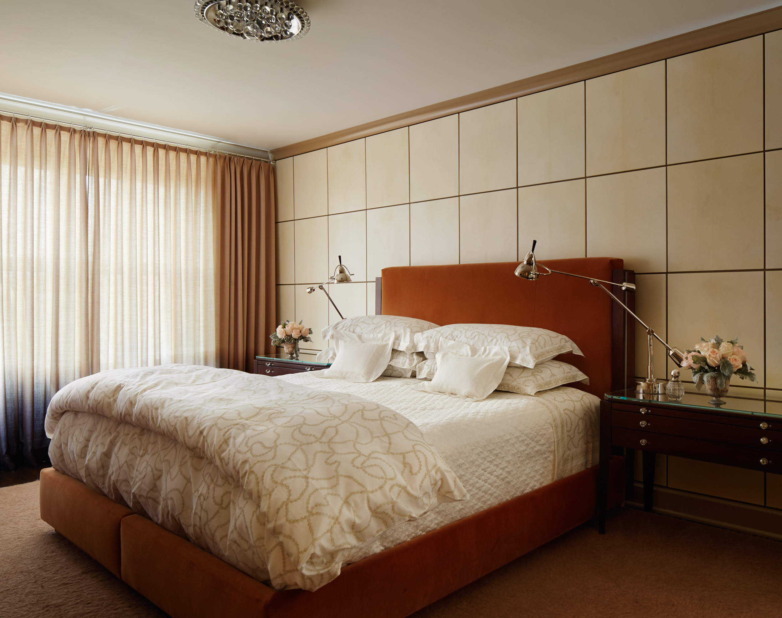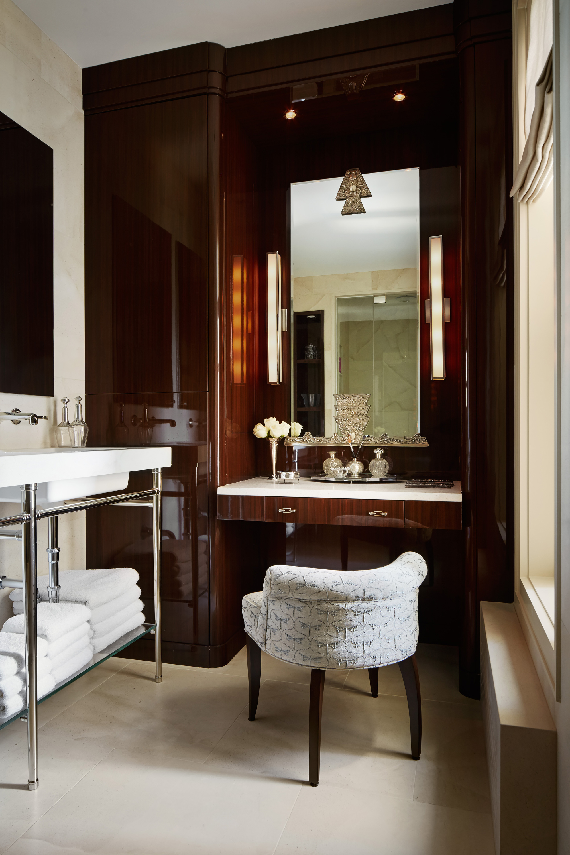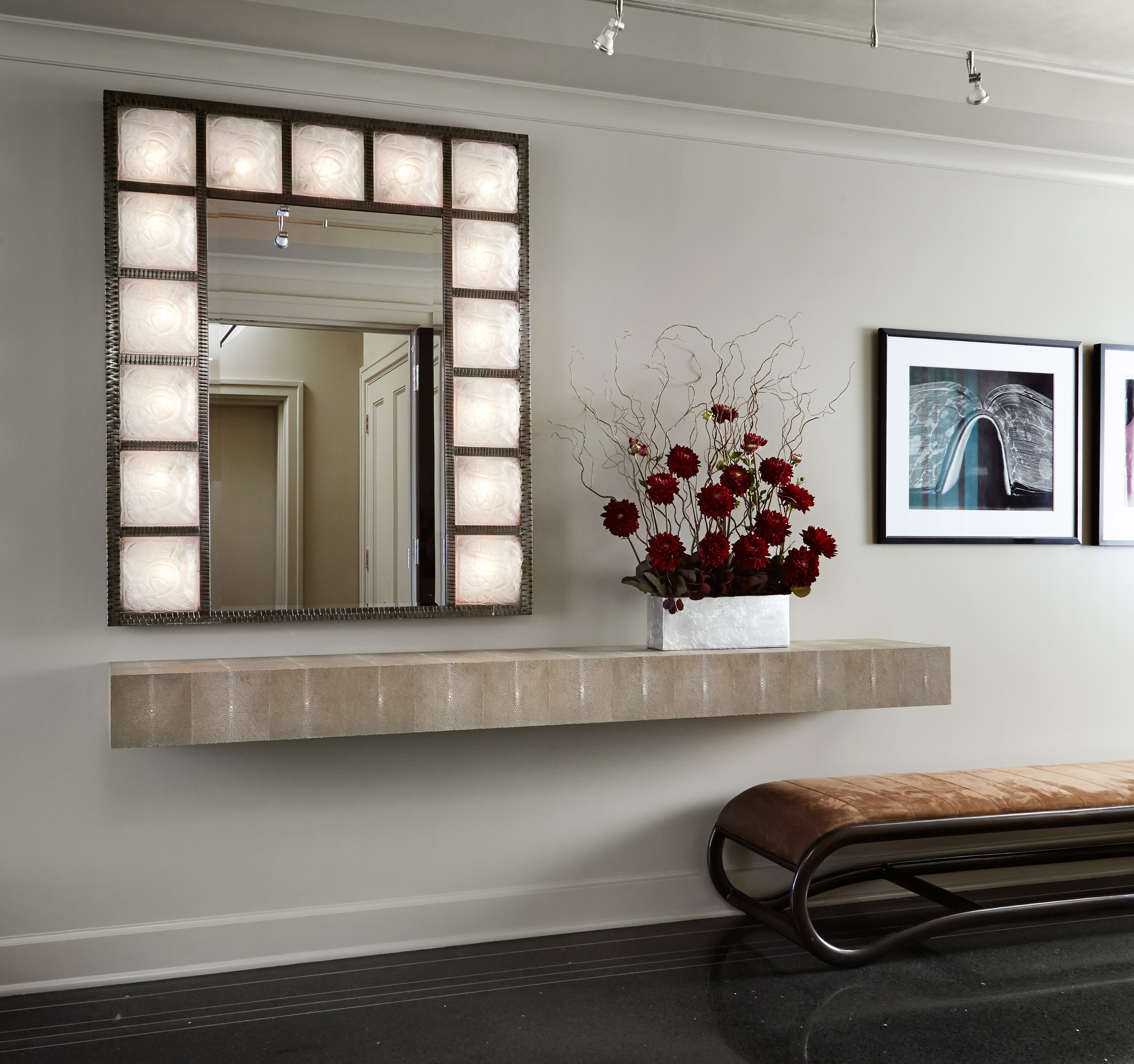 An outstanding collection of Art Deco furnishings, lighting, artwork, and accessories imbues this full-floor, Lake Shore Drive condominium with uncommon presence. Tailored in style and masculine in hue, it cocoons even as it welcomes light and views. Macassar ebony millwork and travertine floors evince its luxurious architectural side; sumptuous materials including silk velvet, cashmere, and shagreen articulate exquisite decorative elegance – as do pashmina draperies and parchment-covered walls. Also climbing walls: poetry, in this case written by the owner’s son and artistically hand-lettered by a local artisan. Layered in the extreme and collected over time, interiors exemplify the owner’s vocation as a jewelry designer, avocation as a world traveler, and passion for detail in measures both large and small. Embellished by a wide-ranging collection of sophisticated artworks – think everything from vintage New Yorker covers to a graphic Lichtenstein – it is a testament to the decorative power of self-assurance.
