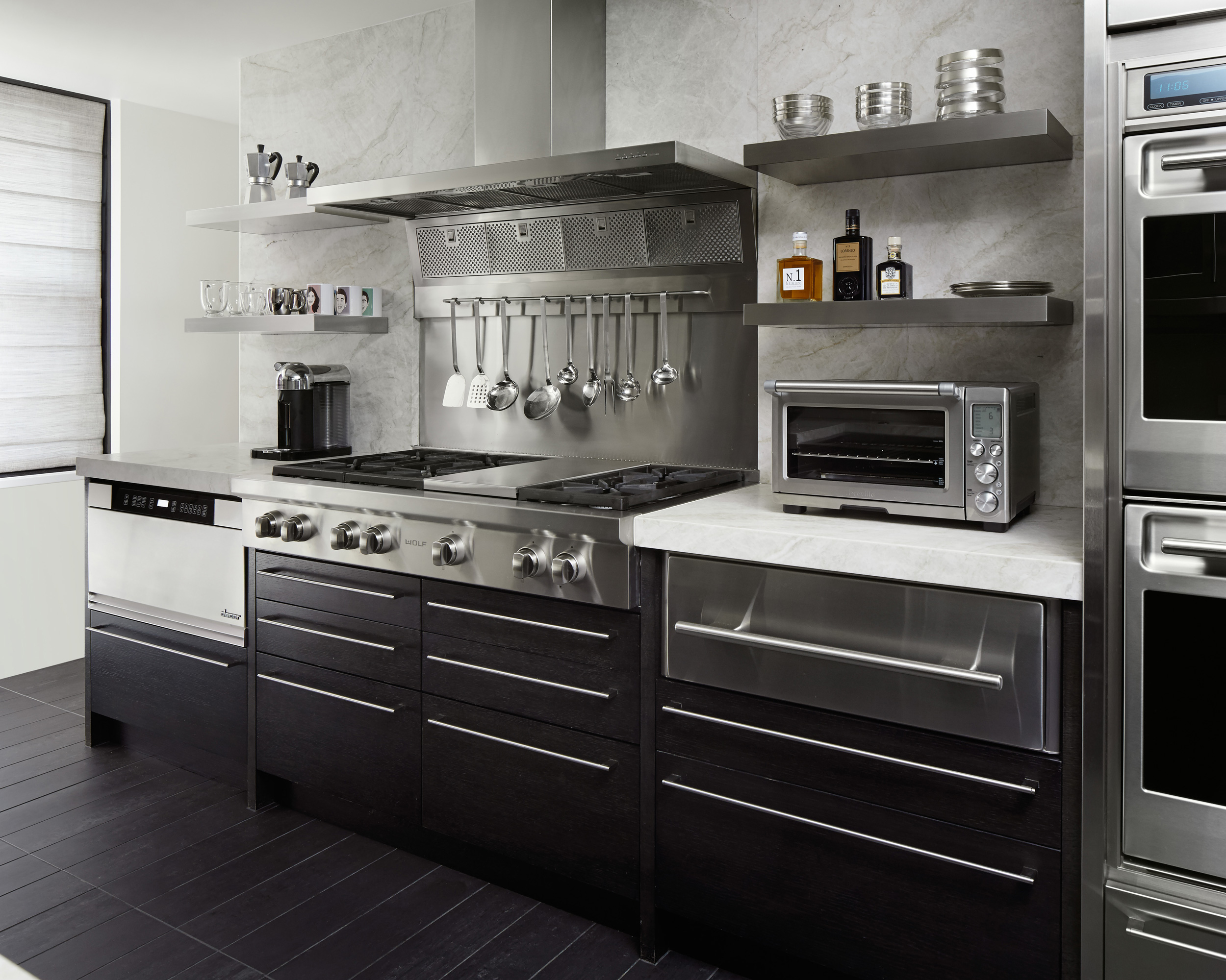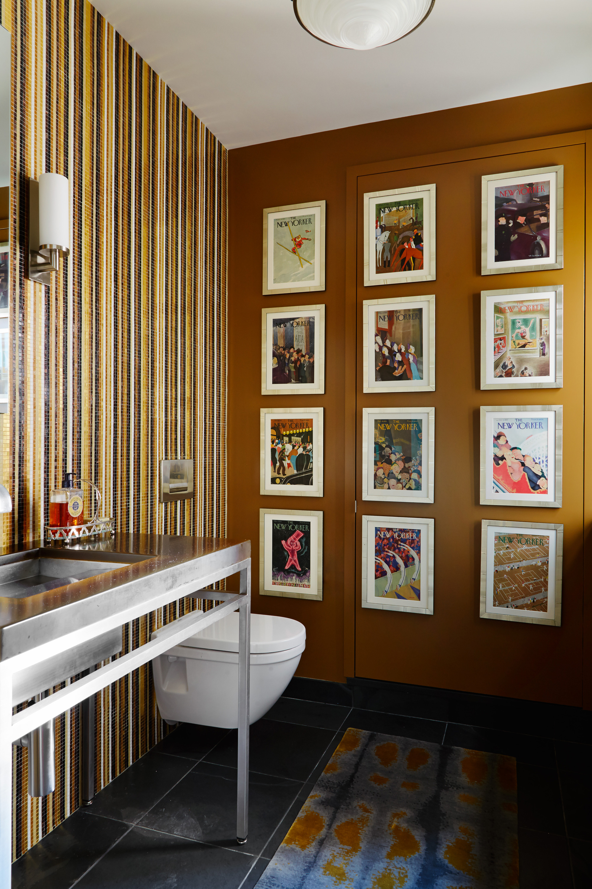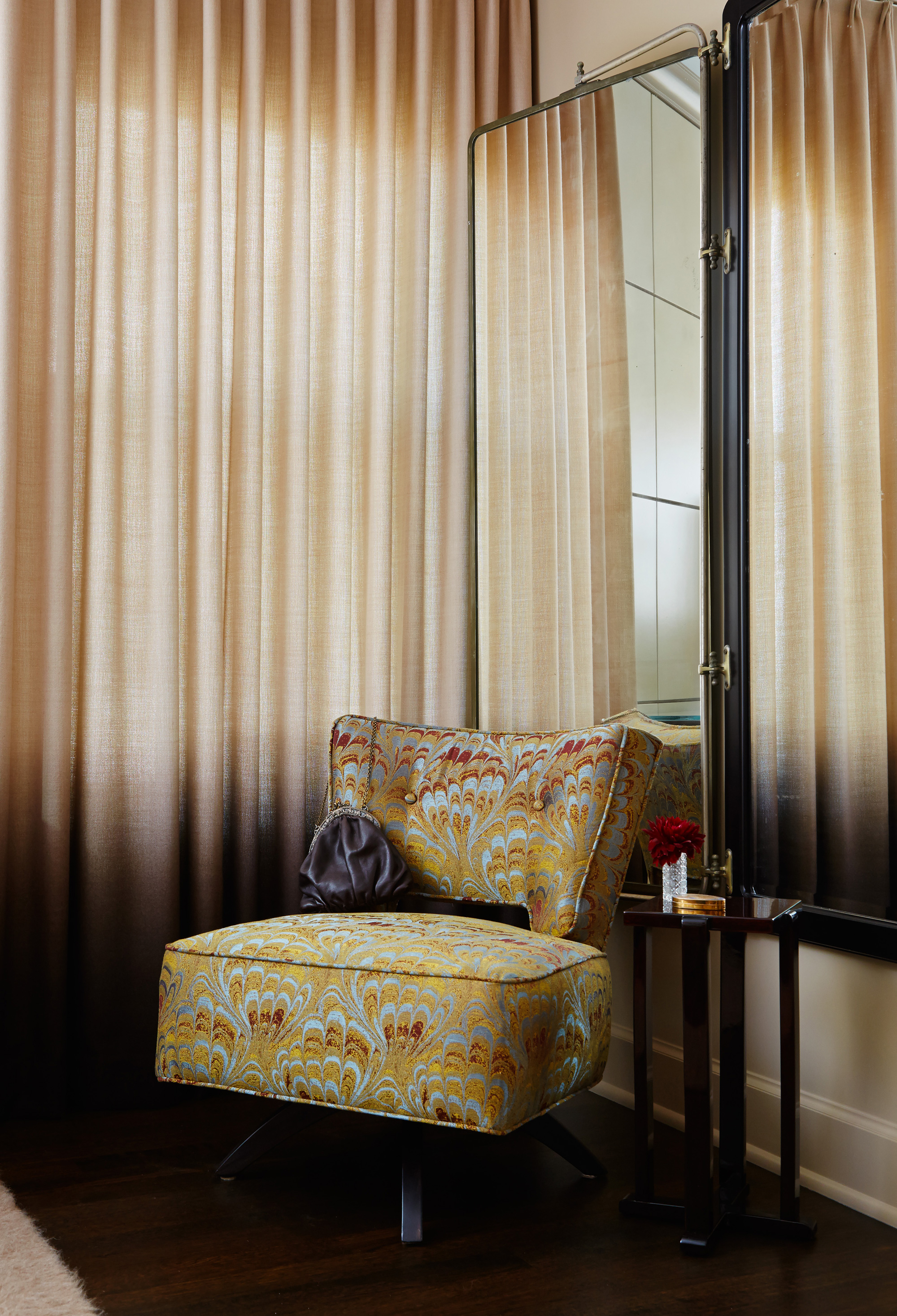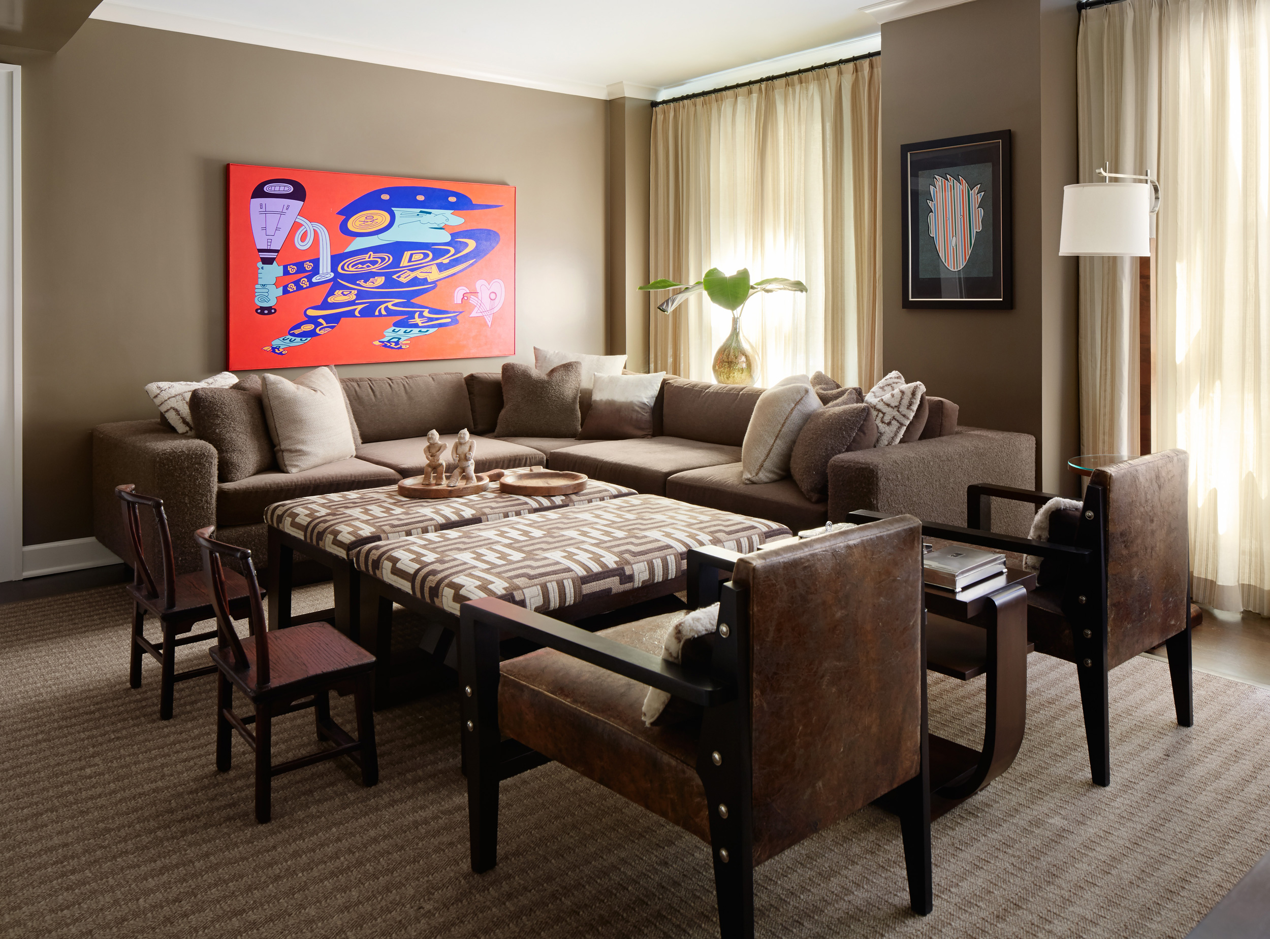 An outstanding collection of Art Deco furnishings, lighting, artwork, and accessories imbues this full-floor, Lake Shore Drive condominium with uncommon presence. Tailored in style and masculine in hue, it cocoons even as it welcomes light and views. Macassar ebony millwork and travertine floors evince its luxurious architectural side; sumptuous materials including silk velvet, cashmere, and shagreen articulate exquisite decorative elegance – as do pashmina draperies and parchment-covered walls. Also climbing walls: poetry, in this case written by the owner’s son and artistically hand-lettered by a local artisan. Layered in the extreme and collected over time, interiors exemplify the owner’s vocation as a jewelry designer, avocation as a world traveler, and passion for detail in measures both large and small. Embellished by a wide-ranging collection of sophisticated artworks – think everything from vintage New Yorker covers to a graphic Lichtenstein – it is a testament to the decorative power of self-assurance.