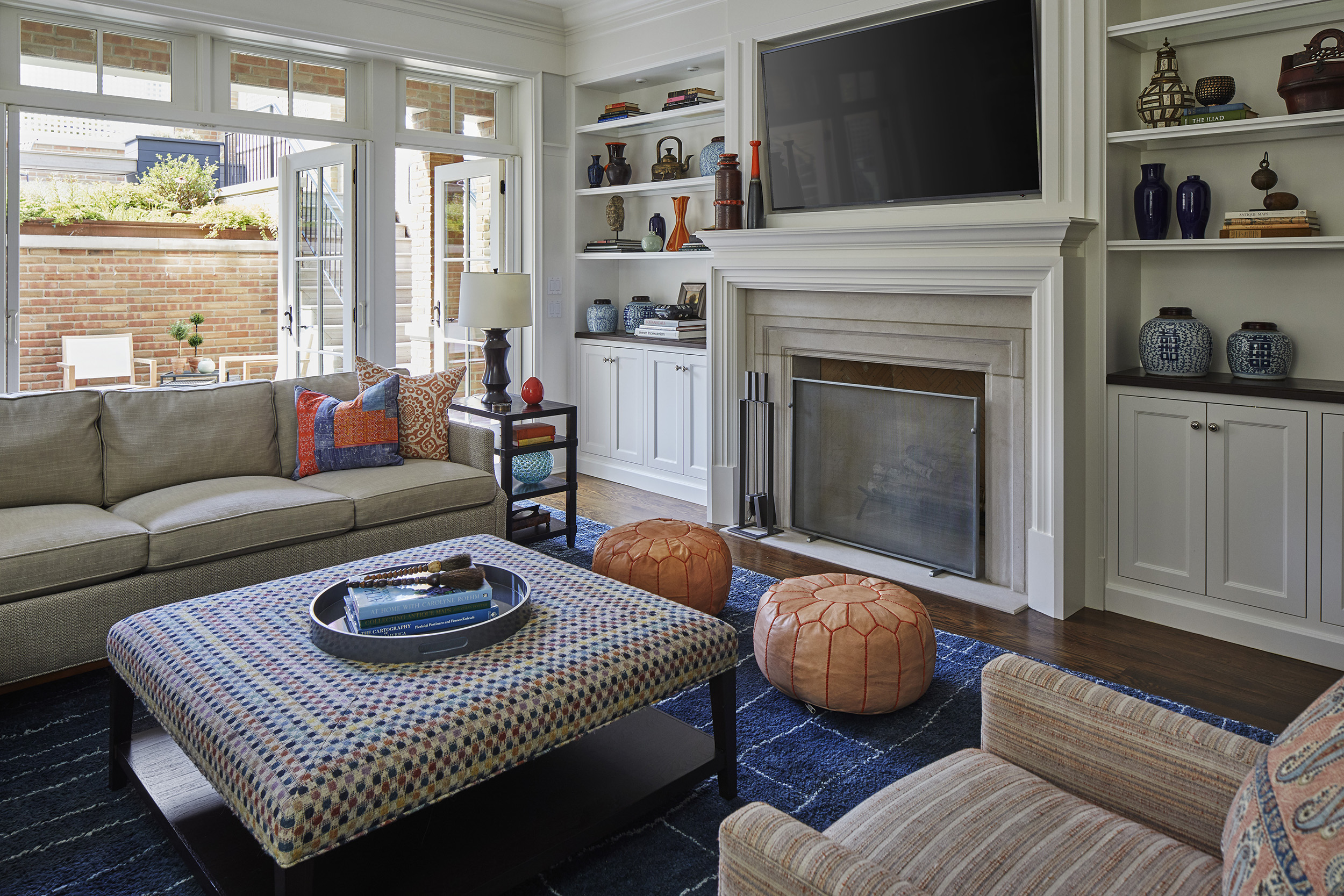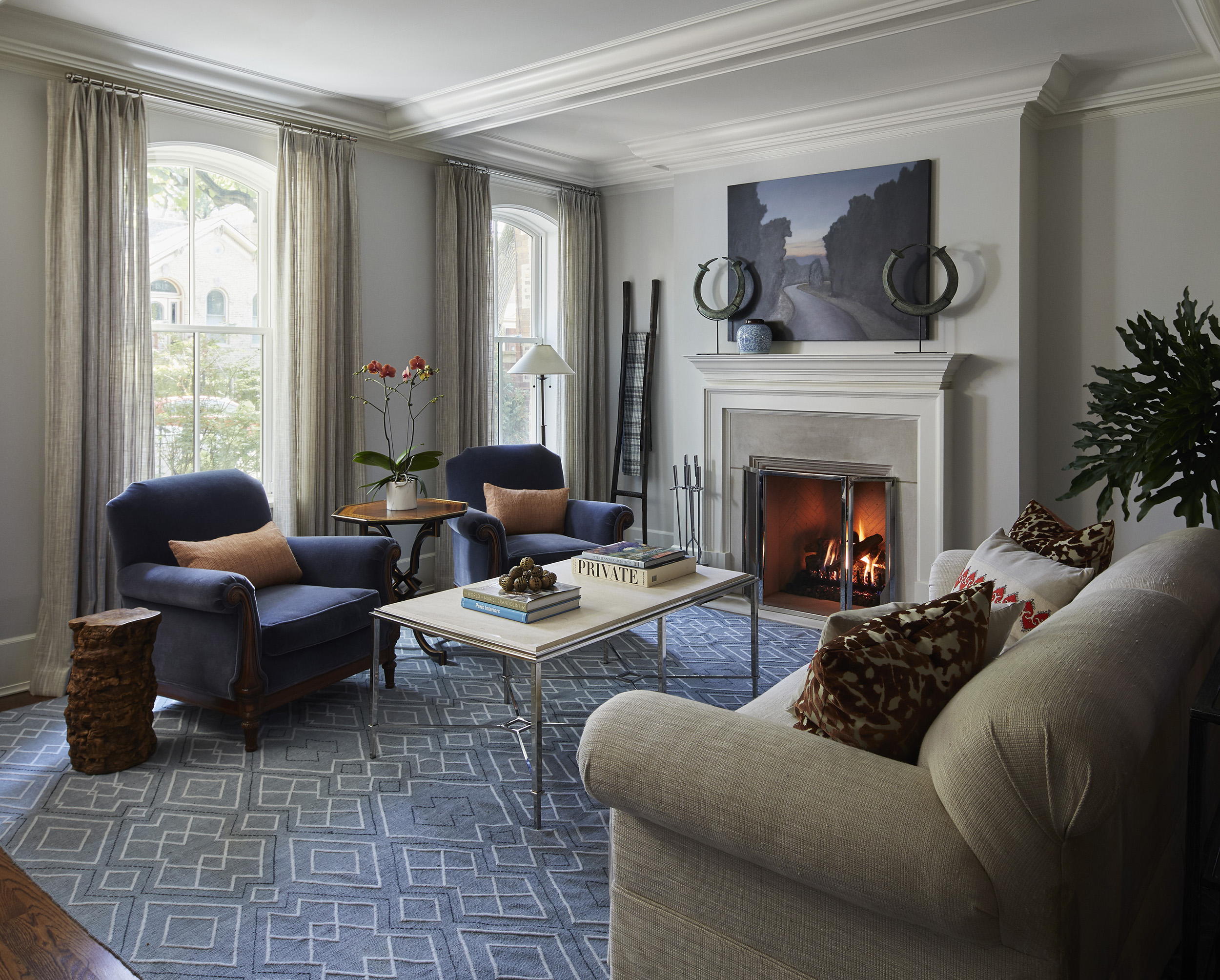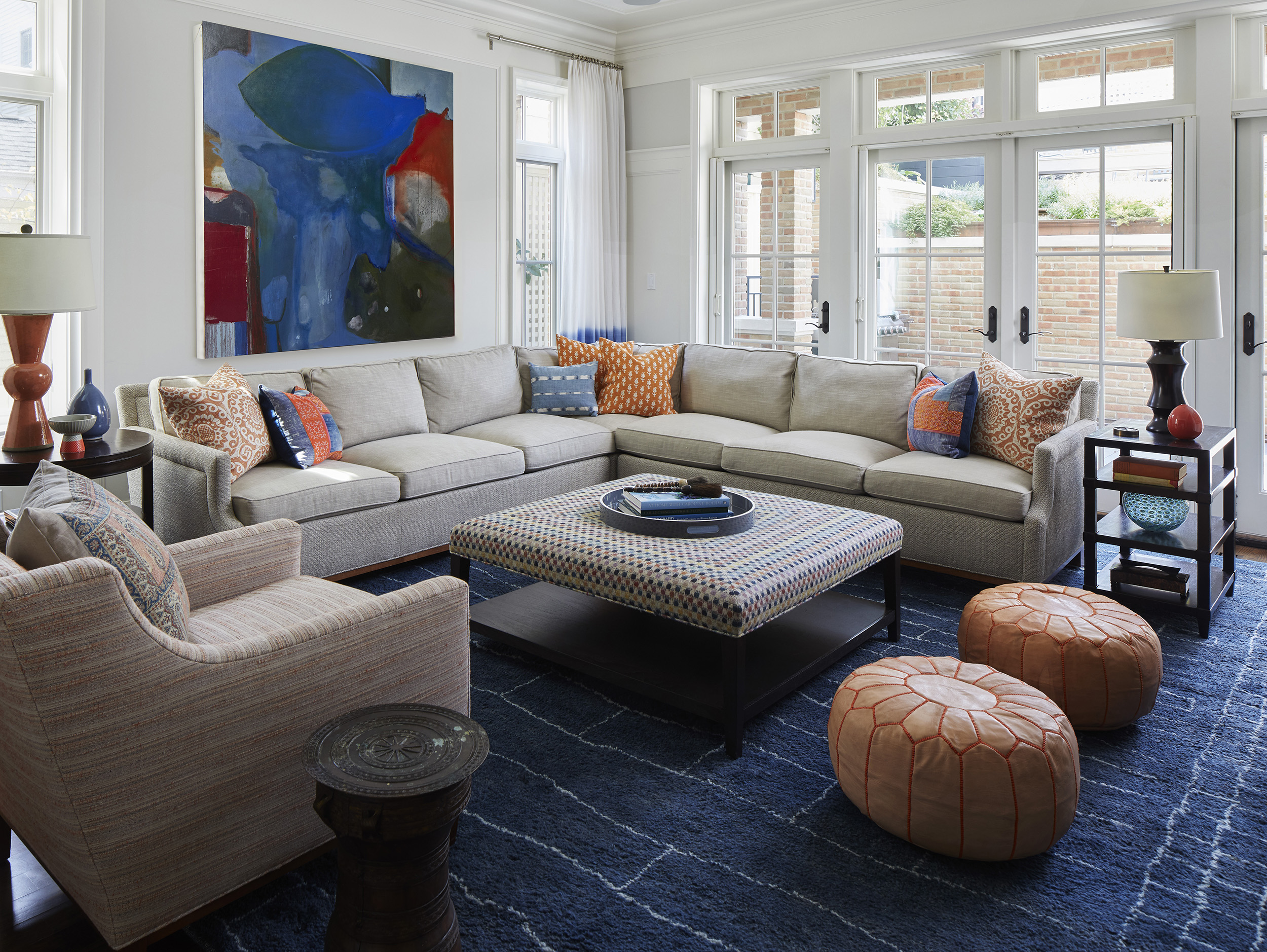 Welcomed by an elegant living room layered with muted blues and grays, it transitions front to back into ever-more colorful spaces – culminating in an inviting kitchen and neighboring family room crisped by navy and enlivened with orange. Living space extends further, courtesy of an outdoor gathering area furnished with indoor-worthy detail.