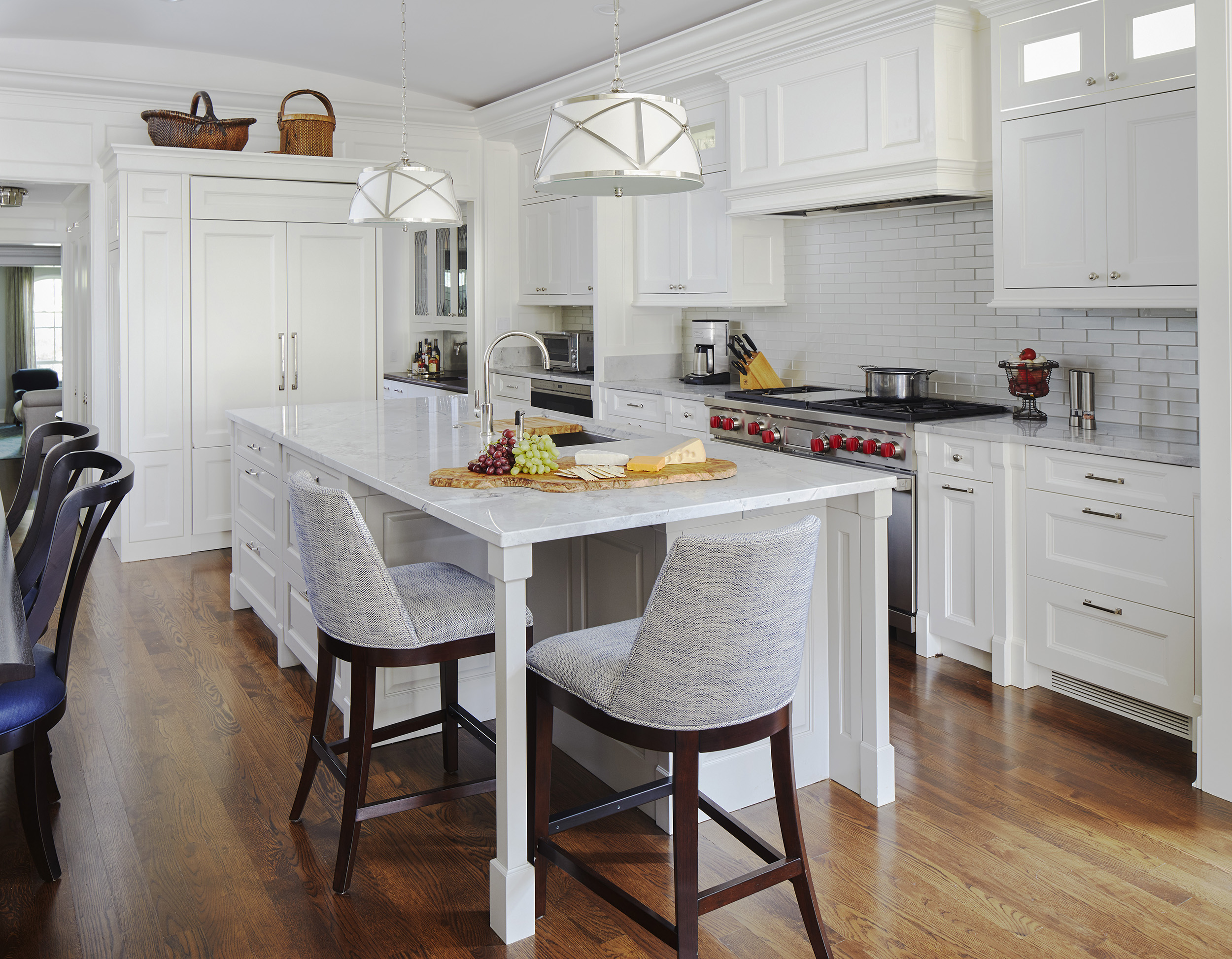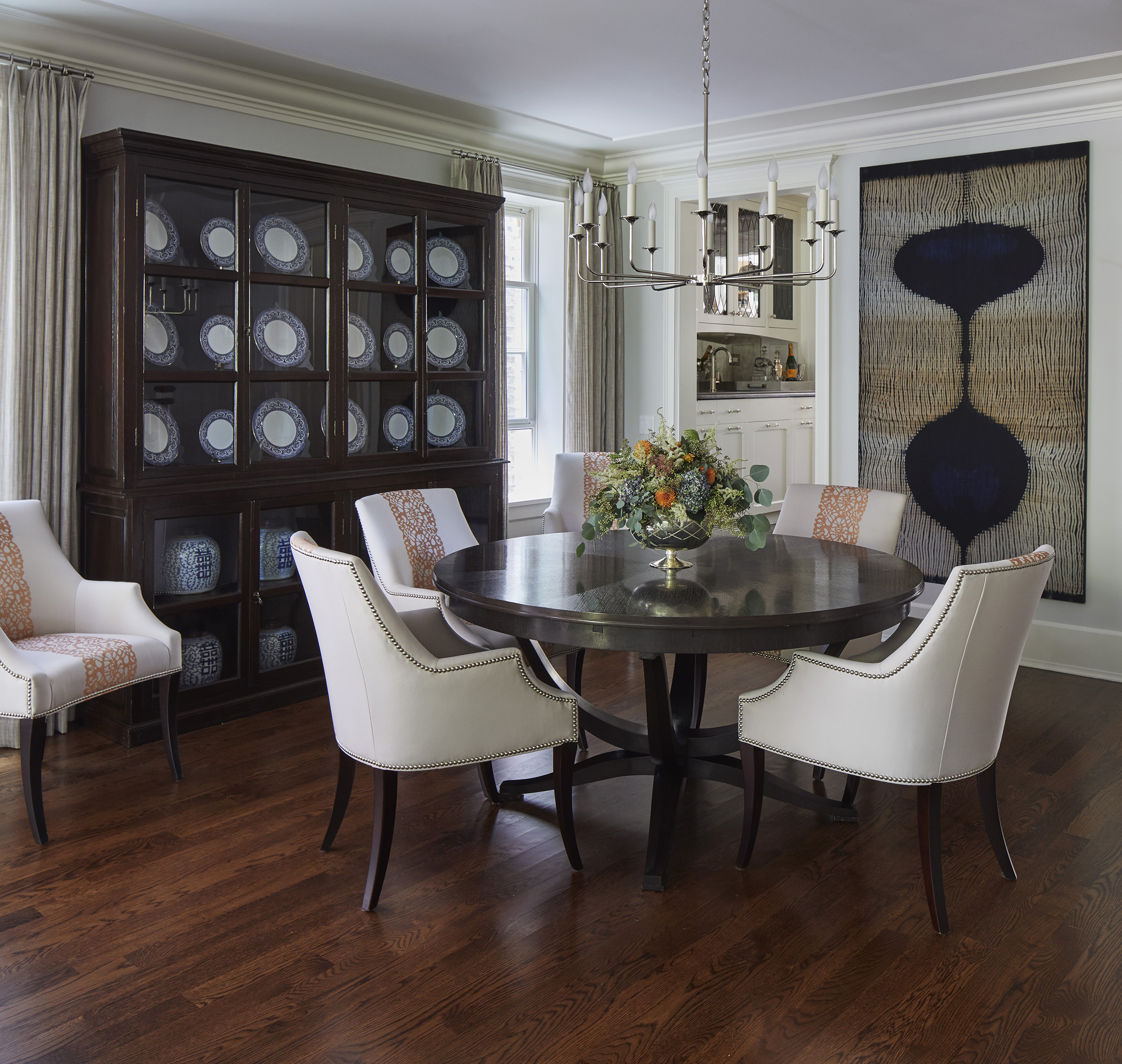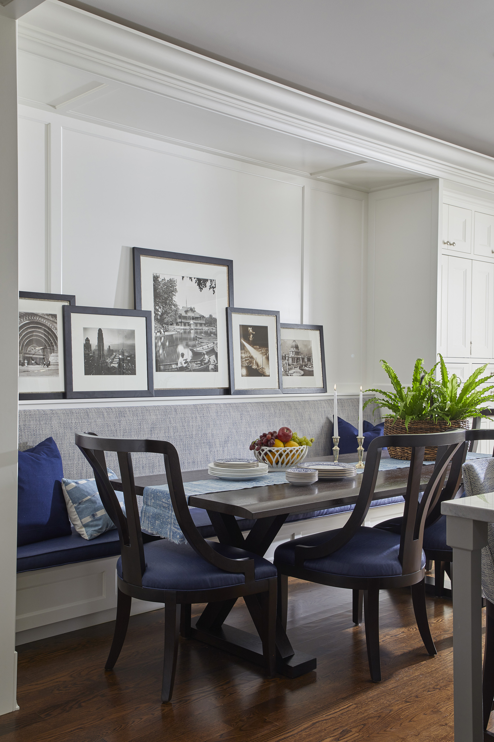 Welcomed by an elegant living room layered with muted blues and grays, it transitions front to back into ever-more colorful spaces – culminating in an inviting kitchen and neighboring family room crisped by navy and enlivened with orange. Living space extends further, courtesy of an outdoor gathering area furnished with indoor-worthy detail.