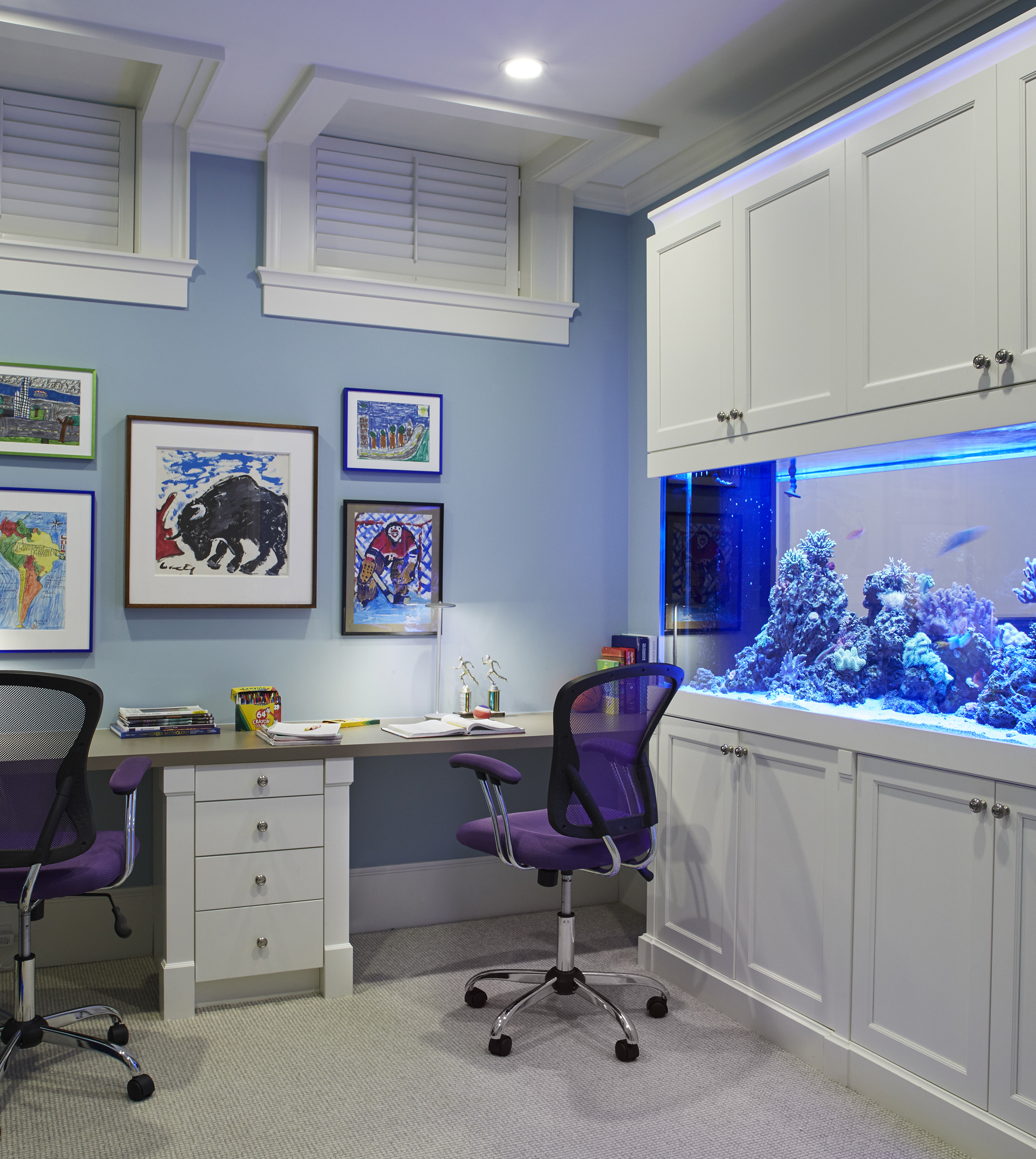 Downstairs, thoughtfully-conceived space will grow with the family’s children. It includes a kids’ lounge area, along with a dedicated room for homework and studies. The two are creatively divided yet visually joined by a two-sided aquarium – an ideal reflection of our clients’ unique interests, and our ability to incorporate those interests into beautifully functional design.